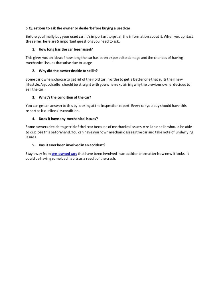 It's a good piece of paper to hold onto. Here's how to buy a used car that won't let you down. Why are you selling the car? Whether you are buying from a. When you spot that used car on your computer screen, it's easy to get carried away. What to ask when buying a car? What questions should i ask when buying a used car? You have to ask the right questions, too. Buying a used car can be risky if you don't know how to find out the condition of the car. Here are some additional questions to ask when you buy a used car from a dealership. Thinking of buying a used or salvage car online? These questions above are the absolute most important questions to ask before buying a used car. Used cars are cheaper than new cars — but buying one comes with a whole bunch of questions that you don't need to ask when you drive off the lot with a brand new that information should be on your carfax, but the title is the official document.